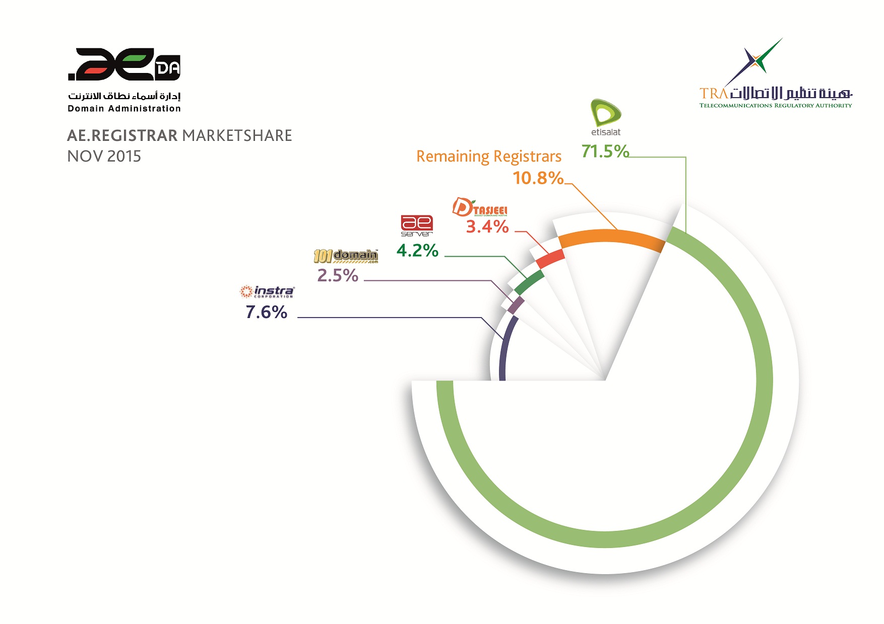 أعلنت الهيئة العامة لتنظيم قطاع الاتصالات عن ارتفاع عدد أسماء النطاق المسجلة ضمن النطاق الوطني (.ae) وذلك من خلال إحصائية شهر نوفمبر 2015، حيث بلغ العدد أكثر من 175 ألف اسم نطاق مع نهاية شهر نوفمبر 2015، فيما بلغ عدد المسجلين المعتمدين لأسماء النطاق 22 مسجِلاً معتمداً يقدمون خدمات تسجيل اسم النطاق على المستوى المحلي والعالمي. وقد بلغت نسبة الزيادة في عدد المسجَلين حتى نهاية شهر نوفمبر 2015 مقارنة بالفترة نفسها من العام الماضي أكثر 40% من اجمالي التسجيل. .