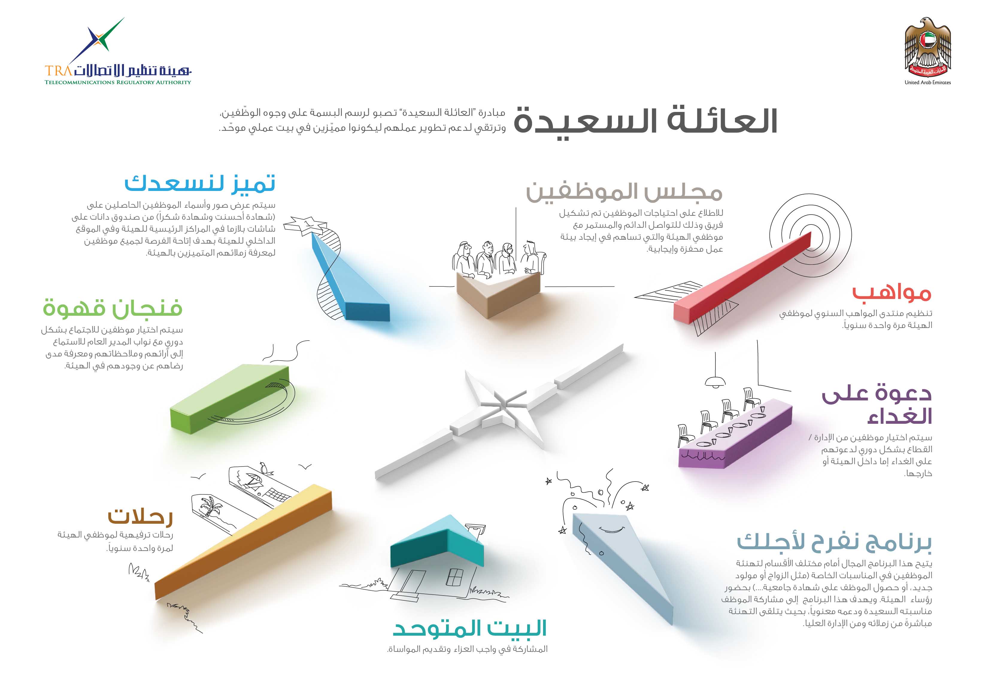 وفي سياق متصل أطلقت الهيئة مبادرة "العائلة السعيدة"، التي تهدف إلى رسم البسمة على وجوه الموظفين، بالتزامن مع إطلاق دليل السعادة والإيجابية، والتي تتضمن عددا من الأنشطة والبرامج الهادفة إلى إضفاء مزيد من الحيوية والمودة إلى جو العمل، أهمها مجلس الموظفين، الذي يقوم على دعم التواصل مع الموظفين، والاطلاع على احتياجاتهم، وتنظيم منتدى المواهب السنوي للموظفين، ومبادرة فنجان قهوة واختيار عدد من الموظفين في الوظائف التشغيلية للاجتماع مع المدير العام بشكل دوري بهدف الاطلاع على آرائهم والرد على استفساراتهم والتعرف إليهم عن قرب.