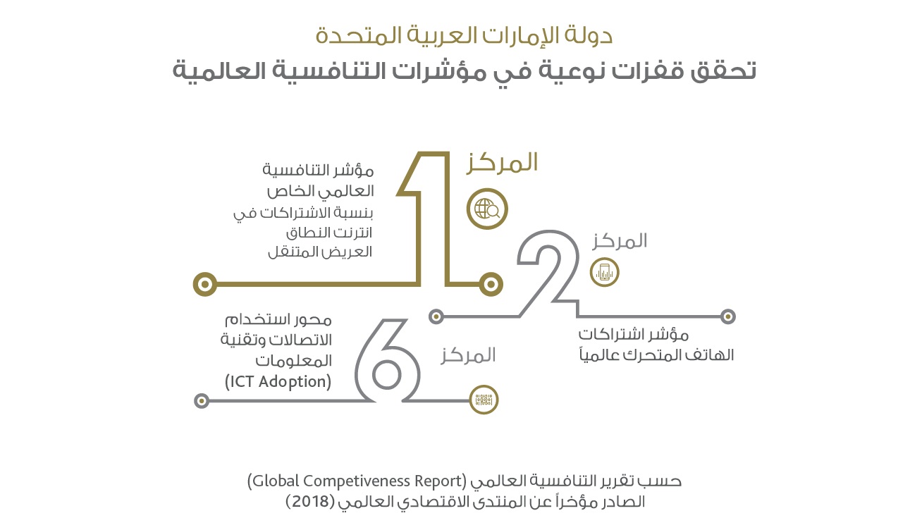 أحرزت دولة الإمارات العربية المتحدة قفزة جديدة في مؤشرات التنافسية العالمية، وذلك حسب تقرير التنافسية العالمي (Global Competiveness Report) الصادر مؤخراً عن المنتدى الاقتصادي العالمي (دافوس) 2018، حيث تقدمت الدولة 18 مركزاً في "محور استخدام الاتصالات وتقنية المعلومات" (ICT Adoption) من المركز الرابع والعشرين إلى المركز السادس عالمياً، ويقيس هذا المحور كفاءة قطاع الاتصالات في الدول، من خلال عدد من مؤشرات التنافسية العالمية المدرجة ضمن المحور.