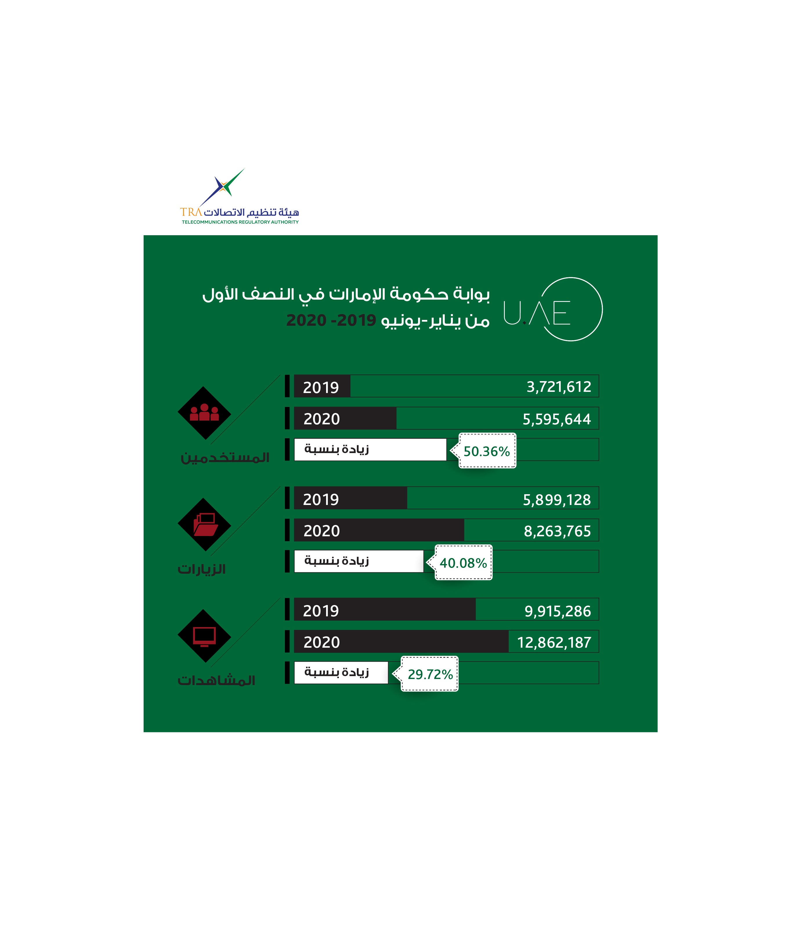 بلغ عدد مستخدمي البوابة الرسمية لحكومة دولة الإمارات “U.AE” ما يربو على خمسة ملايين ونصف خلال النصف الأول لعام 2020 ما يمثل زيادة بنسبة 50% عن عام 2019. وقد بلغ عدد زيارات صفحات البوابة قرابة ثمانية ملايين زيارة، فيما تجاوز عدد مشاهدات صفحاتها 12 مليون ونصف المليون مشاهدة.