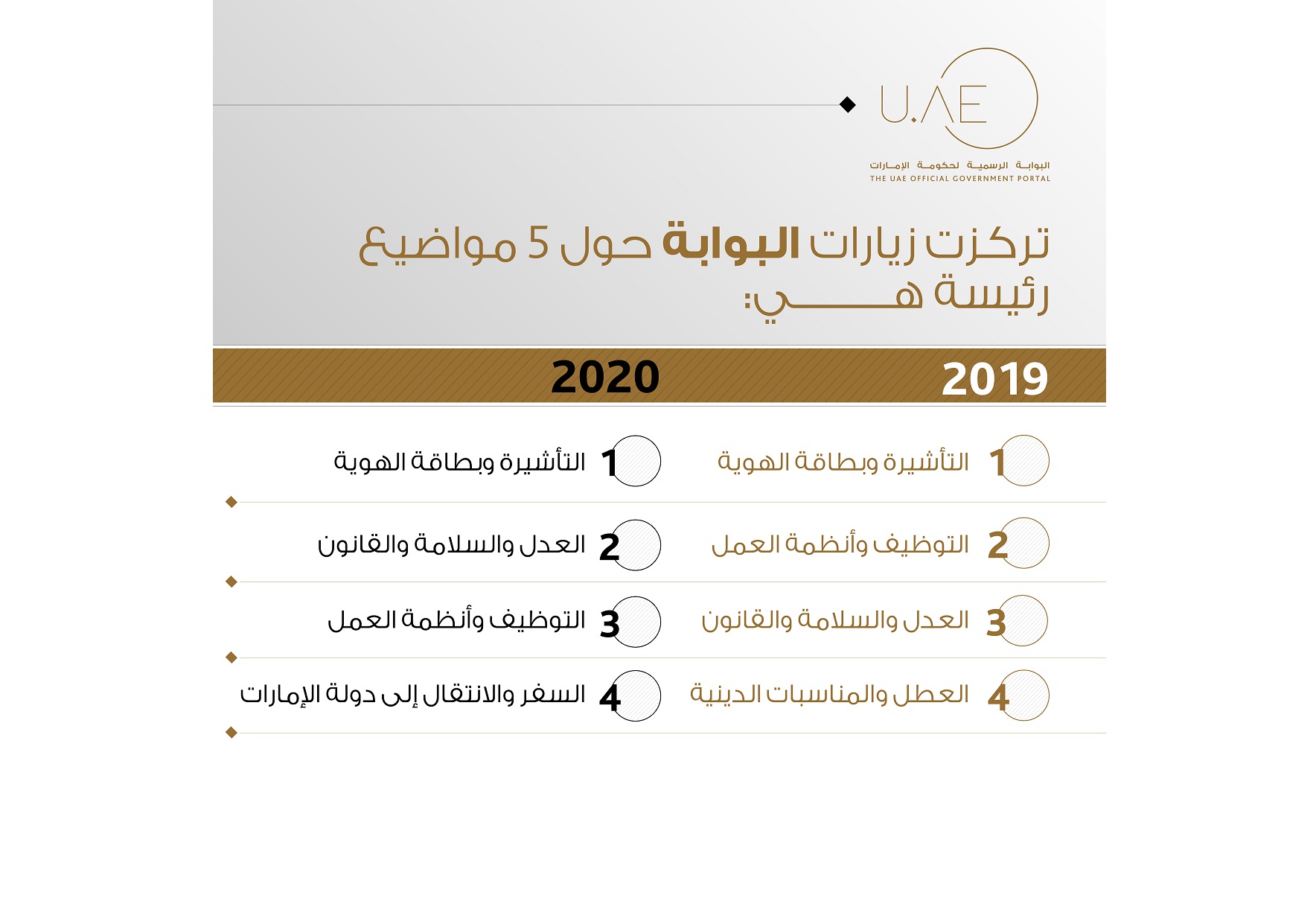 وأشارت الهيئة بأن أكثر الموضوعات زيارة على البوابة الرسمية للدولة كانت التأشيرات وبطاقة الهوية، والعدل والسلامة والقانون، والتوظيف وأنظمة العمل، والسفر والإنتقال إلى دولة الإمارات. كما أشارت الهيئة إلى أن أبناء الجالية الهندية كانوا الأكثر زيارة للبوابة ومن ثم أبناء المملكة العربية السعودية، ومن ثم أبناء جمهورية مصر العربية.