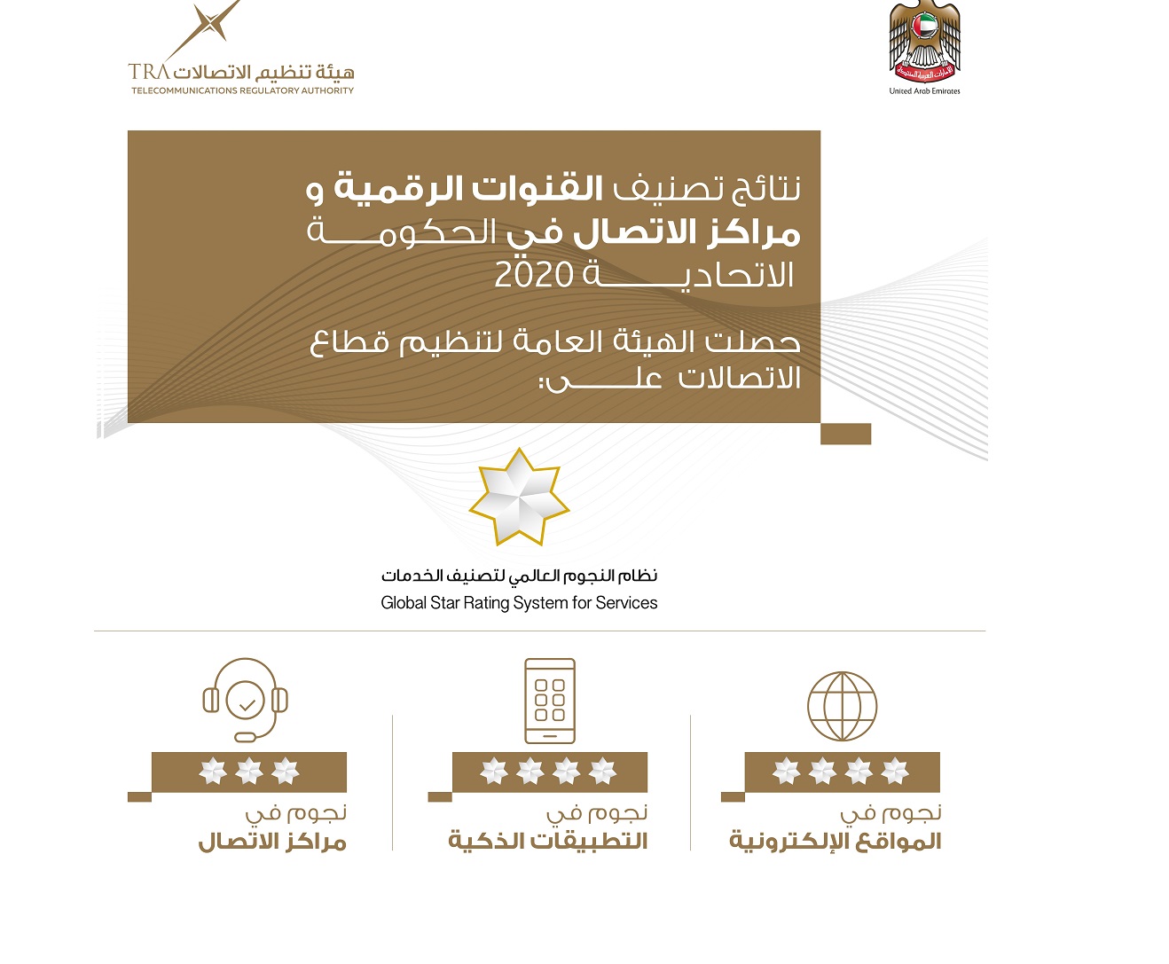 أشاد سعادة حمد عبيد المنصوري مدير عام الهيئة العامة لتنظيم قطاع الاتصالات بالمراكز المتقدمة التي حققتها الهيئة في نتائج نظام "النجوم العالمي" لتصنيف الخدمات والتي اعتمدها صاحب السمو الشيخ محمد بن راشد آل مكتوم نائب رئيس الدولة، رئيس مجلس الوزراء حاكم دبي رعاه الله، حيث حصل كل من موقع الهيئة الإلكتروني وتطبيق الهيئة الذكي على تصنيف أربع نجوم، وذلك في النتائج التي شملت للمرة الأولى تقييم القنوات الرقمية ومراكز الاتصال الحكومية، وغطت نحو 100 قناة تقديم خدمات في 28 جهة.